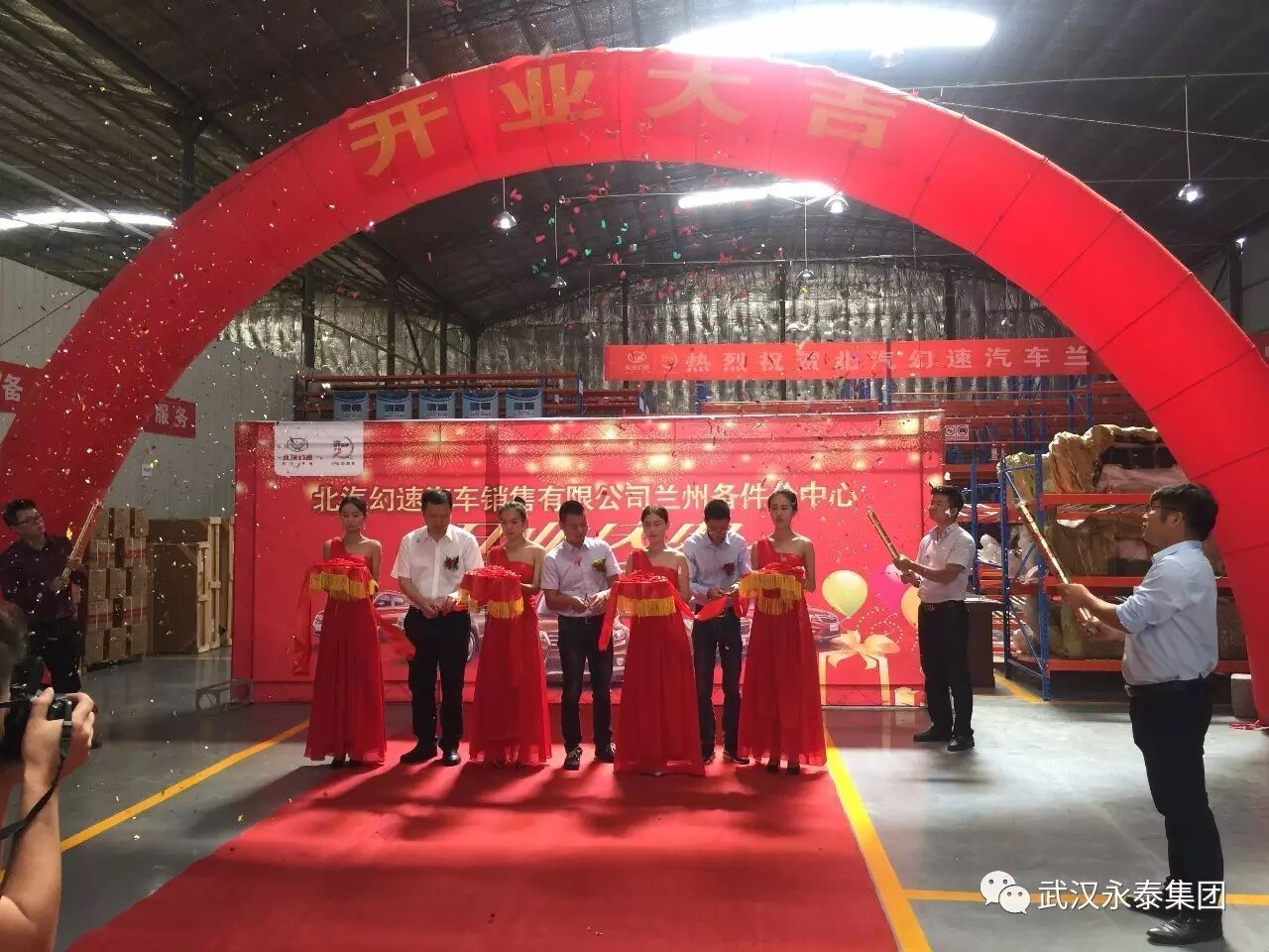 北汽幻速汽车张总,北汽幻速汽车张部长,武汉永泰集团乔董事长为兰州备件分中心开业剪彩。